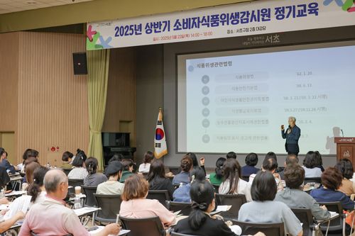 서울 서초구(구청장 전성수)가 22일(목) 오후 2시 구청 2층 대강당에서 서초구 소비자식품위생감시원 107명을 대상으로 '2025년 상반기 소비자식품위생감시원' 정기교육을 실시했다고 밝혔다.