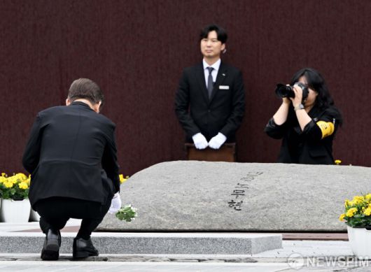 [김해=뉴스핌] 정일구 기자 = 이재명 더불어민주당 대선 후보가 23일 오전 김해시 봉하마을 고 노무현 전 대통령 묘역을 찾아 참배를 하고 있다. 2025.05.23 mironj19@newspim.com