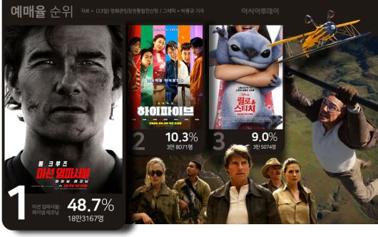 23일 영화관입장권통합전산망에 따르면 '…파이널 레코닝'은 이날 오전 기준 예매율 순위에서 48.7%로 1위(18만3167명)를 독주했다. 2위와 3위는 오는 30일 개봉 예정인 한국 영화 '하이파이브'와 디즈니 애니메이션을 실사로 옮긴 '릴로&스티치'로, 각각 10.3%(3만8071명)와 9.0%(3만5074명)를 기록했다.