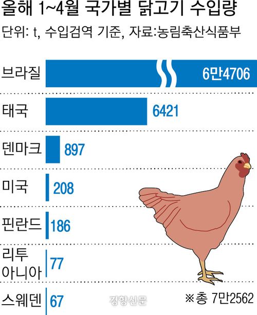 정부는 닭고기 세계 1위 수출국인 브라질에서 고병원성 AI가 발생하자 지난 15일 선적분부터 브라질산 가금육과 가금 생산물 등의 수입을 전면 금지했다. 지난해 한국이 수입한 브라질산 닭고기는 15만8000t으로 전체 수입량(18만3600t)의 86.1%에 이른다. 이는 지난해 국내 닭고기 소비량(79만1000t)의 20% 정도다. 올해 들어서는 지난 4월까지 브라질산이 전체 수입 물량에서 차지하는 비중이 89.2%까지 높아졌다.