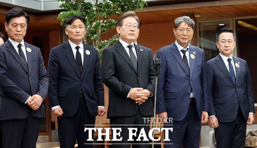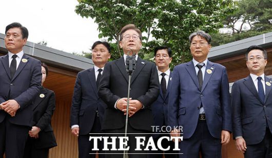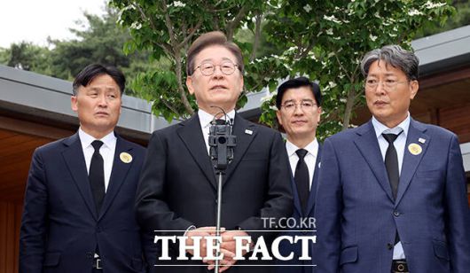 [더팩트ㅣ김해=배정한 기자] 이재명 더불어민주당 대선 후보가 노무현 전 대통령 서거 16주기인 23일 오후 경남 김해시 봉하마을 노 전대통령 관저에서 권양숙 여사와 문재인 전 대통령 부부를 만난 뒤 기자들의 질문에 답하고 있다.