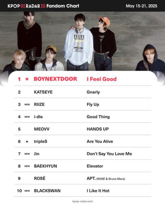 '케이팝레이더'는 23일 한 주간 팬덤 지표의 증감률을 기반으로 아티스트의 성장세를 확인할 수 있는 위클리 팬덤 차트 결과를 발표했다. 이에 따르면, 보이넥스트도어는 지난 13일 발매한 미니 4집 '노 장르(No Genre)'의 타이틀곡 '아이 필 굿(I Feel Good)'으로 1위를 차지했다.