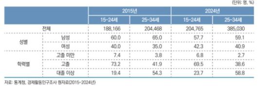 학력별로 보면 2015년 저연령층에서 대졸 이상이 차지하는 비중이 19.4%였으나 2024년에는 23.7%로 증가했고, 청년층 대졸자 역시 54.3%에서 58.8%로 증가했다.