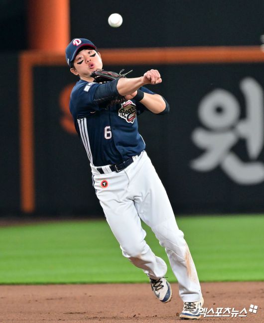 (엑스포츠뉴스 김근한 기자) 두산 베어스 내야수 오명진이 '천재 유격수' 진짜 후계자로 거듭날까. 시즌 도중 갑작스러운 유격수 수비 전환에도 오명진은 공·수에서 흔들림 없이 오히려 더 안정적인 플레이로 시선을 사로잡는다. 두산 유격수 터줏대감이었던 김재호 SPOTV 해설위원도 오명진의 달라진 유격수 수비에 대해 엄지를 치켜세웠다.