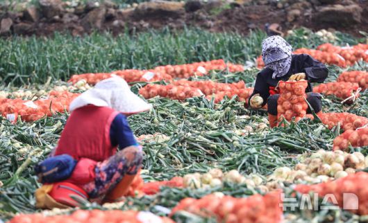 [서귀포=뉴시스] 우장호 기자 = 사진은 지난 3월 26일 오전 제주 서귀포시 대정읍 신도리 일원에서 농민들이 올해 첫 조생양파를 수확하고 있다. 2025.03.26. woo1223@newsis.com |