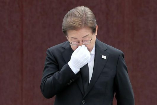 이재명 더불어민주당 대선 후보가 노무현 전 대통령 16주기인 23일 오전 경남 김해시 진영읍 봉하마을 찾아 노 전 대통령 묘역을 참배한 뒤 눈물을 흘리고 있다. 김해=고영권 기자 |