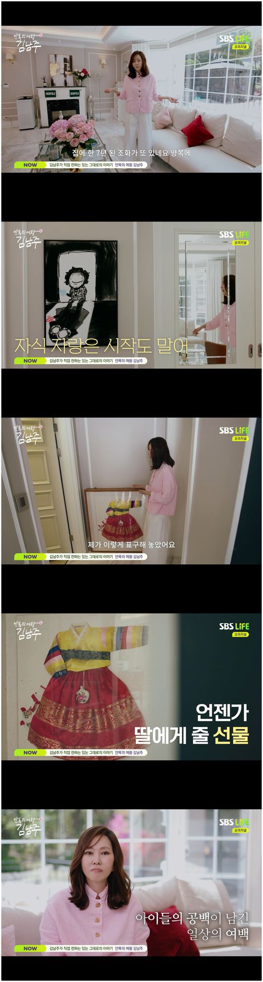 김남주는 단출하지만 깔끔한 현관과 널직하면서도 채광이 듬뿍 드는 거실을 공개했다. 온갖 디자인 가구와 미술품이 한데 있는 거실은 마치 작은 미술관 같았다. 김남주는 “집이 되게 깔끔하죠? 이렇게는 못 산다”라면서 “애들 키울 때, 거실이 좁았다. 잡동사니가 많았다. 그런데 어제 저쪽 방으로 다 치워뒀다”라며 육아에 해방된 후 정리를 했다고 밝혔다.
