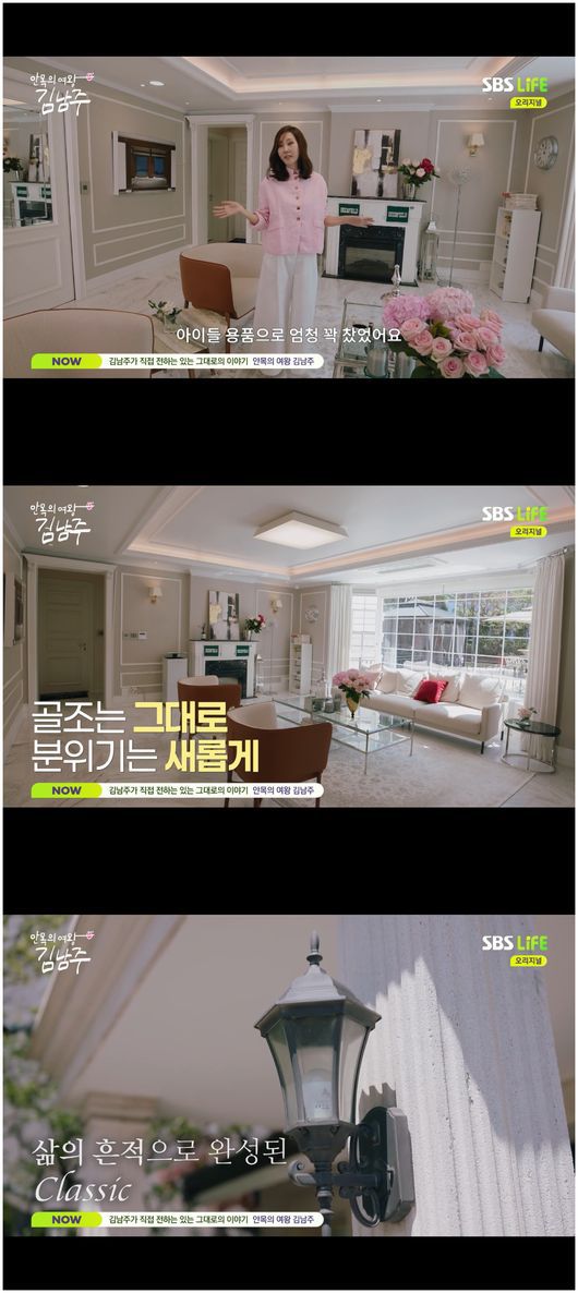 22일 첫 방영한 SBS Life ‘안목의 여왕’에서는 결혼한 지 20년 된 저택에서 자신만의 안락한 삶을 꾸리며 사는 배우 김남주가 등장했다. 화사한 봄을 그대로 담은 정원과 육중하면서도 진중한 초록빛을 뽐내는 대문을 자랑한 김남주. 그의 얼굴에는 뿌듯한 미소가 서려 있었다.