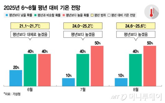 6월 기온은 평년보다 비슷하거나 높을 확률이 각각 40%로 '평년보다 대체로 높을 것'으로 전망됐다. 7월과 8월 기온은 평년보다 높을 확률이 50%, 평년과 비슷할 확률이 40%로 '평년보다 높을 것'으로 분석됐다.