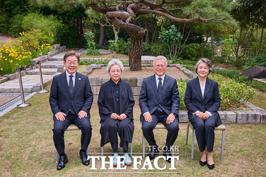 [더팩트ㅣ김해=배정한 기자] 이재명 더불어민주당 대선 후보(왼쪽)가 고 노무현 전 대통령 서거 16주기인 23일 경남 김해시 진영읍 봉하마을을 방문해 권양숙 여사(왼쪽 두번째), 문재인 전 대통령(왼쪽 세번째), 김정숙 여사와 기념 촬영을 하고 있다.