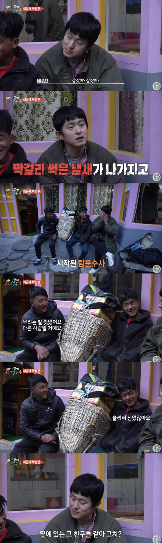 기안84는 셰르파들에게 "잘 잤냐"고 묻다가 "와 누구야 양말. 양말 썩은 내, 막걸리 썩은 냄새가 나서 죽을 뻔 했다"고 토로했다.