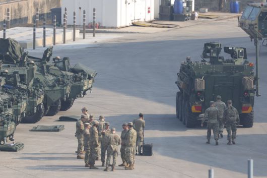 한미연합연습 ‘자유의 방패’(FS·Freedom Shield) 연습이 시작된 10일 경기도 동두천시 주한미군 기지에서 스트라이커 장갑차가 대기하고 있다. (사진=연합뉴스) |