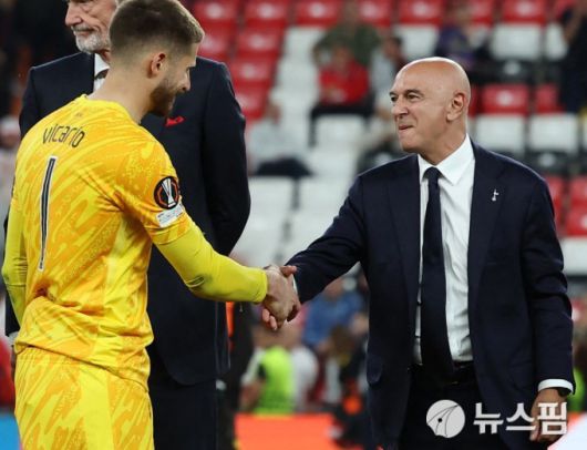 [빌바오 로이터 =뉴스핌] 박상욱 기자 = 다니엘 레비 토트넘 회장이 22일 유로파리그 결승을 마치고 시상식에서 비카리오 토트넘 골키퍼와 악수하며 격려하고 있다. 2025.5.22 psoq1337@newspim.com