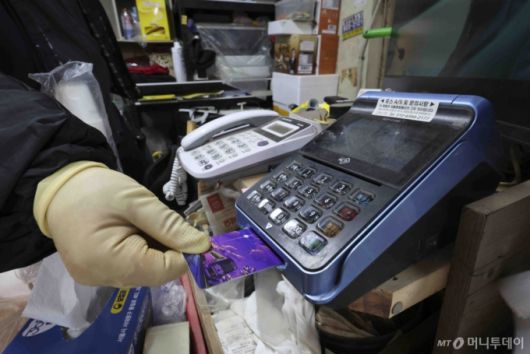 [서울=뉴시스] 김근수 기자 = 14일 서울 시내의 한 점포에서 점주가 신용카드로 물건을 결제하고 있다. |