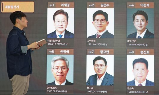 제21대 대선을 열하루 앞둔 23일 경기도 과천시 중앙선거관리위원회 선거종합상황실 스크린에 후보 등록 현황이 표시돼 있다. 연합뉴스 |
