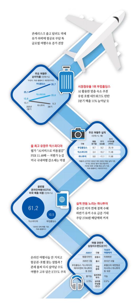 월가는 올해 살아날 여행 수요와 AI를 접목한 OTA 업체의 진화에 따라 여행 관련주를 매수하라는 입장이다. 부킹홀딩스에 대해 월가 투자은행 39곳의 목표주가 평균은 5535.56달러다. 19일(현지시간) 주가 기준으로 약 3%의 상승 여력이 남아 있다. 배당수익률은 0.71%다. 작년 1분기부터 배당을 시작했다. 익스피디아는 배당률이 약 1%다. 향후 12개월 동안 벌어들일 순익 기준으로 따진 주가수익비율(PER)에선 익스피디아가 11.48배(야후파이낸스 기준)로 부킹홀딩스(25.19배)보다 저평가돼 있다. 현 주가에서 월가의 목표주가까지 남아 있는 상승 여력은 13.4%다. 저스틴 포스트 뱅크오브아메리카 애널리스트는 "익스피디아는 2025년 최고의 유망주"라며 "AI를 활용한 고객 응대 서비스를 내놓는 등 운영비 절감이 효과를 보면서 실적 개선 여지가 다른 여행 관련주보다 더 크다"고 전했다.
