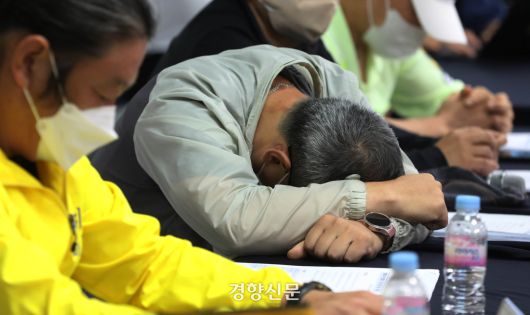 2022년 8월 24일 서울 중구 진실·화해를위한과거사정리위원회에서 열린 형제복지원 인권침해 사건 진실규명 결정 발표 기자회견에 참석한 피해 생존자가 당시 정근식 위원장의 발표를 들으며 괴로워하고 있다. 김창길기자 |