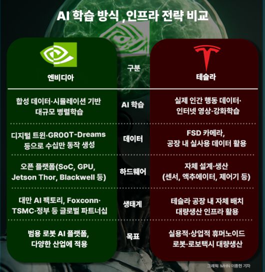 (MHN 이종헌 기자) 엔비디아와 테슬라는 로봇을 '똑똑하게' 만드는 방식부터 근본적으로 다르다.