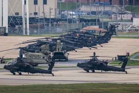 23일 경기 평택시 캠프 험프리스에 주한미군 아파치 헬기와 시누크 헬기가 세워져 있다. 2025.05.23 평택=뉴시스 |