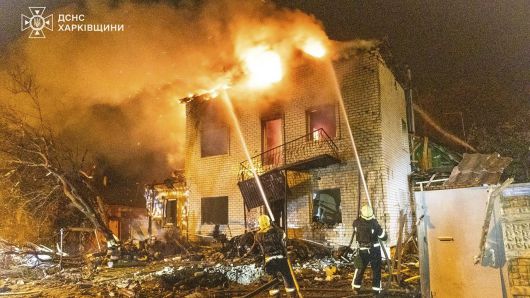 ▲ 30일 우크라이나 하르키우에서 발생한 러시아 공격 이후 화재를 진압하기 위해 응급 서비스 요원들이 일하고 있다.
