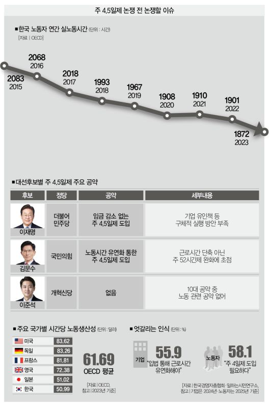# 거대 양당의 대선후보가 일제히 '주 4.5일제'를 공약으로 내놨다. 구체적인 추진 방향은 다르다. 이재명 더불어민주당 대선후보는 "임금 감소 없는 실질적 근로시간 단축"을 주장한 반면 김문수 국민의힘 대선후보는 "근로시간 단축이 아닌 유연화"에 방점을 찍고 있다.