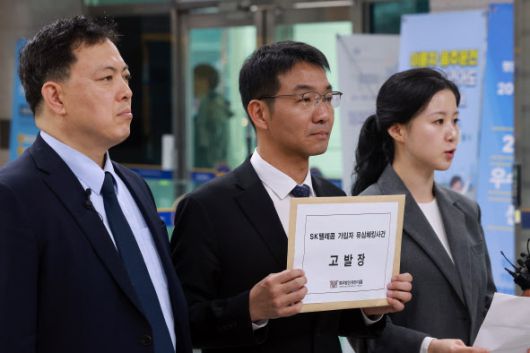 법무법인 대륜 손계준(왼쪽부터), 신종수, 지민희 변호사가 1일 SKT 해킹 사태와 관련해 서울 남대문경찰서에 유영상 SKT 대표이사와 SKT를 상대로 업무상 배임·위계공무집행방해 혐의 고소·고발장을 제출하기에 앞서 입장을 밝히고 있다.(사진=연합뉴스) |