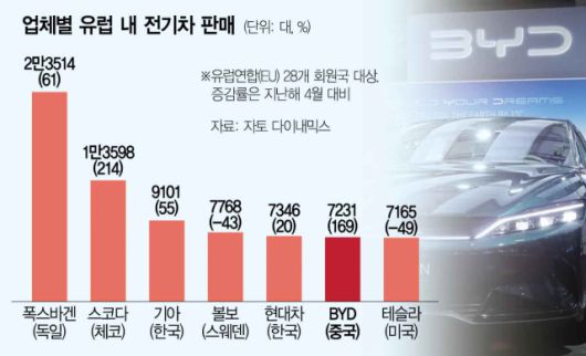 22일(현지 시간) 시장조사 업체 자토다이내믹스에 따르면 BYD는 지난달 유럽연합(EU) 전체 28개 회원국에서 전기차를 7231대 판매하며 지난해 같은 달에 비해 169% 급증해 전체 순위 10위에 올랐다. 테슬라의 4월 판매량(7165대)은 전년 대비 49%나 감소해 11위를 기록하며 ‘톱 10’에서 밀려났다. 현대차와 기아의 합계 판매량은 1만 6447대로 1위인 폭스바겐(2만 3514대)을 바짝 뒤쫓았다.