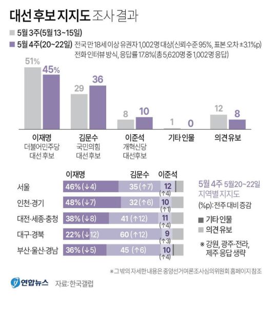 이재명 45%·김문수 36%·이준석 10% <한국갤럽>