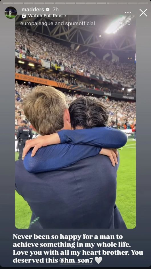 이후 매디슨은 자신의 SNS를 통해 손흥민을 언급했다. 그는 "내 인생에서 누군가가 무언가를 이루는 걸 보고 이렇게 행복했던 적은 처음이다. 진심으로 사랑해. 이걸 받을 자격이 있어"라고 적었다.