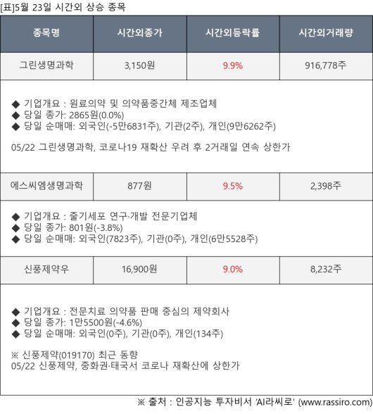 [서울=뉴스핌] 로보뉴스 = 5월 23일, 인공지능 투자비서 ‘AI라씨로’가 그린생명과학(114450), 에스씨엠생명과학(298060) 등 시간외 단일가 매매 상승률 상위 종목들에 대한 최근 동향을 분석했다.