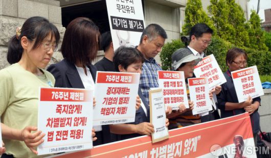 [서울=뉴스핌] 최지환 기자 = 16일 오전 서울 종로구 헌법재판소 앞에서 열린 중대재해처벌법 헌법소원 기각 요구 및 엄정 집행 촉구 기자회견에서 참가자들이 묵념을 하고 있다. 2024.07.16 choipix16@newspim.com |