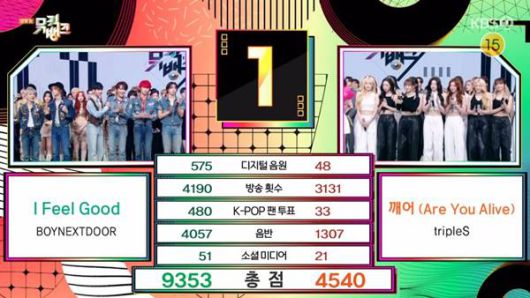 이날 보이넥스트도어의 'I feel good'(아이 필 굿)이 총점 9353점으로, 총점 4540점을 받은 트리플에스의 '깨어 (Are You Alive)'를 제치고 1위를 차지했다.