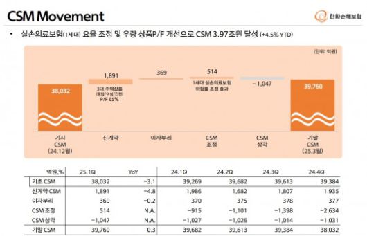 한화손보는 신계약 CSM 규모 감소에도 불구하고, 올해 1분기 말 기준 전체 CSM 규모가 전년 동기 대비 0.2% 소폭 증가한 3조9760억원을 기록했다. 이는 1세대 실손의료보험 위험률 조정효과로 CSM 조정액이 514억원 증가한 영향이다.