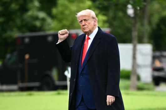 22일(현지시간) 도널드 트럼프 미국 대통령이 백악관에서 대통령 전용헬기(마린 원)를 타러 가던 중 취재진에게 주먹을 들어 보이고 있다.(사진=AFP)