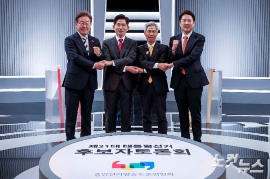 23일 서울 영등포구 여의도 KBS 스튜디오에서 열린 중앙선거방송토론위원회 주관 제21대 대통령선거 후보자 토론회에 앞서 더불어민주당 이재명(왼쪽부터), 국민의힘 김문수, 민주노동당 권영국, 개혁신당 이준석 대선후보가 기념촬영을 하고 있다. 국회사진기자단 |