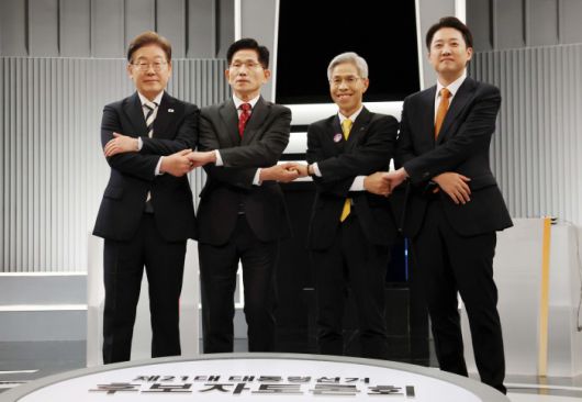 [서울=뉴스핌] 국회사진기자단 = 23일 서울 영등포구 KBS본관 스튜디오에서 열린 중앙선거방송토론위원회 주관 제21대 대통령선거 2차 후보자토론회 시작에 앞서 각 정당 대선 후보들이 기념촬영을 하고 있다. (왼쪽부터) 이재명 더불어민주당, 김문수 국민의힘, 이준석 개혁신당, 권영국 민주노동당 대선 후보. 2025.05.23 photo@newspim.com |
