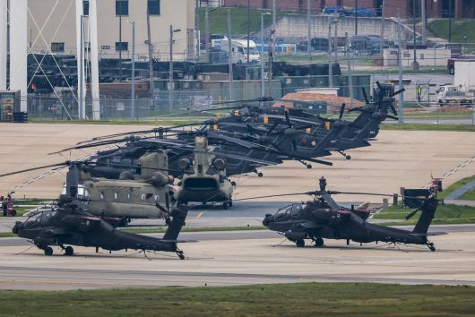 23일 경기 평택시 캠프 험프리스에 주한미군 아파치 헬기와 시누크 헬기가 세워져 있다. 평택=뉴시스 |