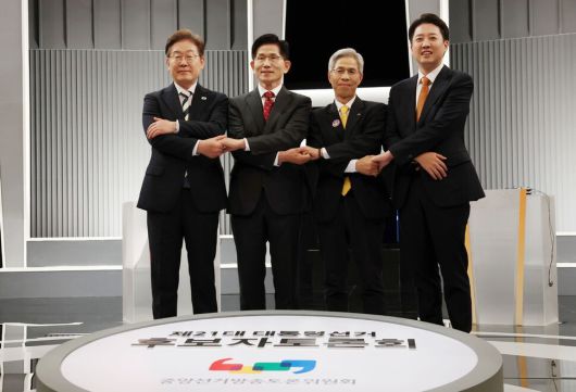 23일 저녁 서울 영등포구 KBS본관 스튜디오에서 열린 중앙선거방송토론위원회 주관 제21대 대통령선거 2차 후보자토론회 시작에 앞서 후보들이 기념사진을 찍고 있다. (왼쪽부터) 이재명 더불어민주당, 김문수 국민의힘, 권영국 민주노동당, 이준석 개혁신당 대통령 후보. 국회사진기자단 |