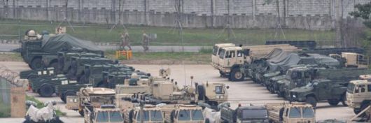 미 정부가 주한미군 4,500명 감축을 검토하고 있다는 월스트리트저널 보도 내용이 전해진 23일 오전 경기도 동두천시의 주한미군 기지에 미군 전투 장비들이 집결해 있다. 동두천=연합뉴스 |