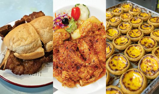 유네스코가 세계 최초 퓨전 요리로 공인한 매캐니즈를 대표하는 음식인 폭찹번(주빠빠오), 아프리카 치킨, 에그타르트(왼쪽부터). /마카오관광청·김성윤 기자 |