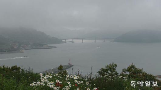 쑥섬이 머리에 이고 있는 ‘별 정원’에서 바라본 바다. 봄비답지 않은 빗속에서 바다와 하늘 모두 연회색 빛으로 하나가 된 듯하다. 멀리 사양도(왼쪽 섬)와 내나로도(오른쪽 섬)를 잇는 다리는 사양교다. |