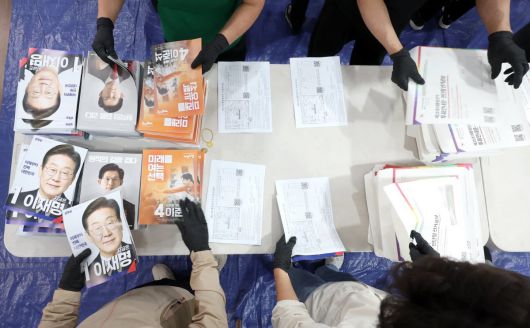 23일 오전 인천 서구 석남2동 행정복지센터 별관에서 복지센터 관계자들이 제21대 대통령선거 전단형 선거공보와 투표안내문 발송작업을 하고 있다. 2025.05.23 인천=뉴시스 |
