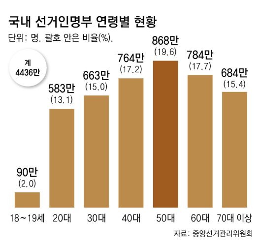 제21대 대통령 선거에 투표권을 갖는 유권자가 4439만1871명으로 23일 확정됐다. 제20대 대선 유권자보다 19만4179명 늘어난 것. 유권자 수가 가장 많은 연령대는 50대로 전체 유권자의 20%에 육박했다. 60대 이상 고령층은 3명 중 1명꼴로, 20대와 30대를 합친 것보다 많았다.