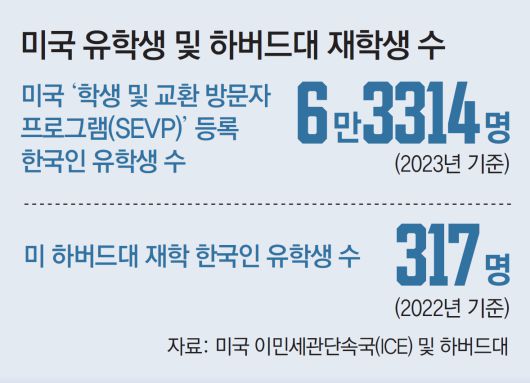 미국 도널드 트럼프 행정부가 22일(현지 시간) 대표적인 아이비리그(미 동부의 8개 명문 사립대) 명문대인 하버드대의 외국인 학생 등록 자격을 박탈하는 초강수를 뒀다. 하버드대가 ‘반(反)유대주의 근절’ 등 정부의 교육 정책 변경 요구를 거부했다는 게 이유다. 하버드대가 “국토안보부의 외국인 학생 차단은 불법”이라며 23일 법원에 소송을 제기한 가운데 한국인 재학생과 예비 졸업생들은 충격에 휩싸였다.
