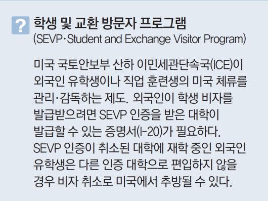 크리스티 놈 미 국토안보장관은 이날 X에 올린 글에서 “하버드대가 법을 준수하지 않음에 따라 2025∼2026학년도 ‘학생 및 교환방문자 프로그램(SEVP)’ 인증을 상실했다”고 밝혔다. 미국 대학들은 국토안보부로부터 SEVP 인증을 받아야 외국인 학생들에게 입학허가서(I-20)를 발급할 수 있다. I-20은 유학생이 미국 입출국 시 반드시 소지해야 할 뿐 아니라 학생비자(F-1)를 받는 데도 필수인 서류다.