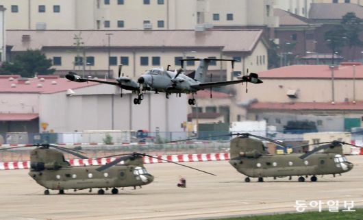 23일 경기 평택 주한 미군기지 캠프 험프리스에서 미 육군의 정찰기 RC-12X ‘가드레일’이 이륙하고 있다. 평택=홍진환 기자 jean@donga.com |