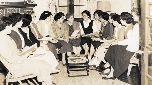 올해 설립 100주년을 맞은 이화여대 영어영문학부는 한국 사회에 수많은 여성 리더를 배출하며 엘리트 교육의 중추 역할을 했다. 사진은 지난 1966년 이대 영문학부 학생들이 학교 영학관(英學館·학생들이 서양 예법과 생활 영어 등을 배우던 건물)에서 선교사 교수들과 영어로 토론하는 모습. /이화역사관 |