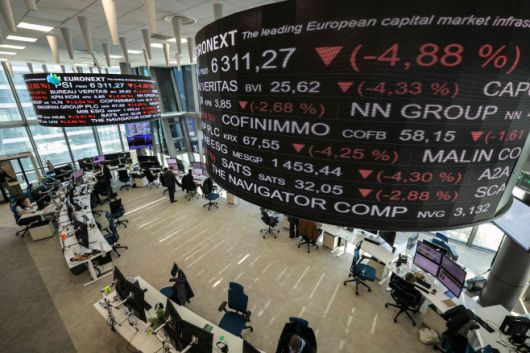 2025년 4월 7일(현지시간) 프랑스 파리 유로넥스트 거래소의 디지털 스크린에 시장 지표가 표시되고 있다./AFP·연합 |