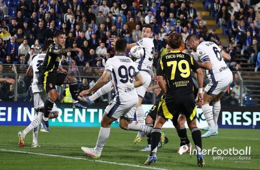 인테르가 선제골을 만들었다. 전반 20분 코너킥 상황에서 찰하놀루의 패스를 더 브레이가 헤더 슈팅으로 연결해 골망을 흔들었다. 이어 전반 24분 자레프스키의 왼발 슈팅은 골문 위로 벗어났다.