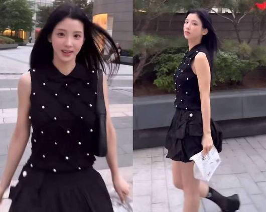 블라우스에는 다이아몬드 형태로 배치된 진주 디테일이 더해져 단조로운 블랙 컬러에 입체감을 부여했다.사진=강다은 SNS |